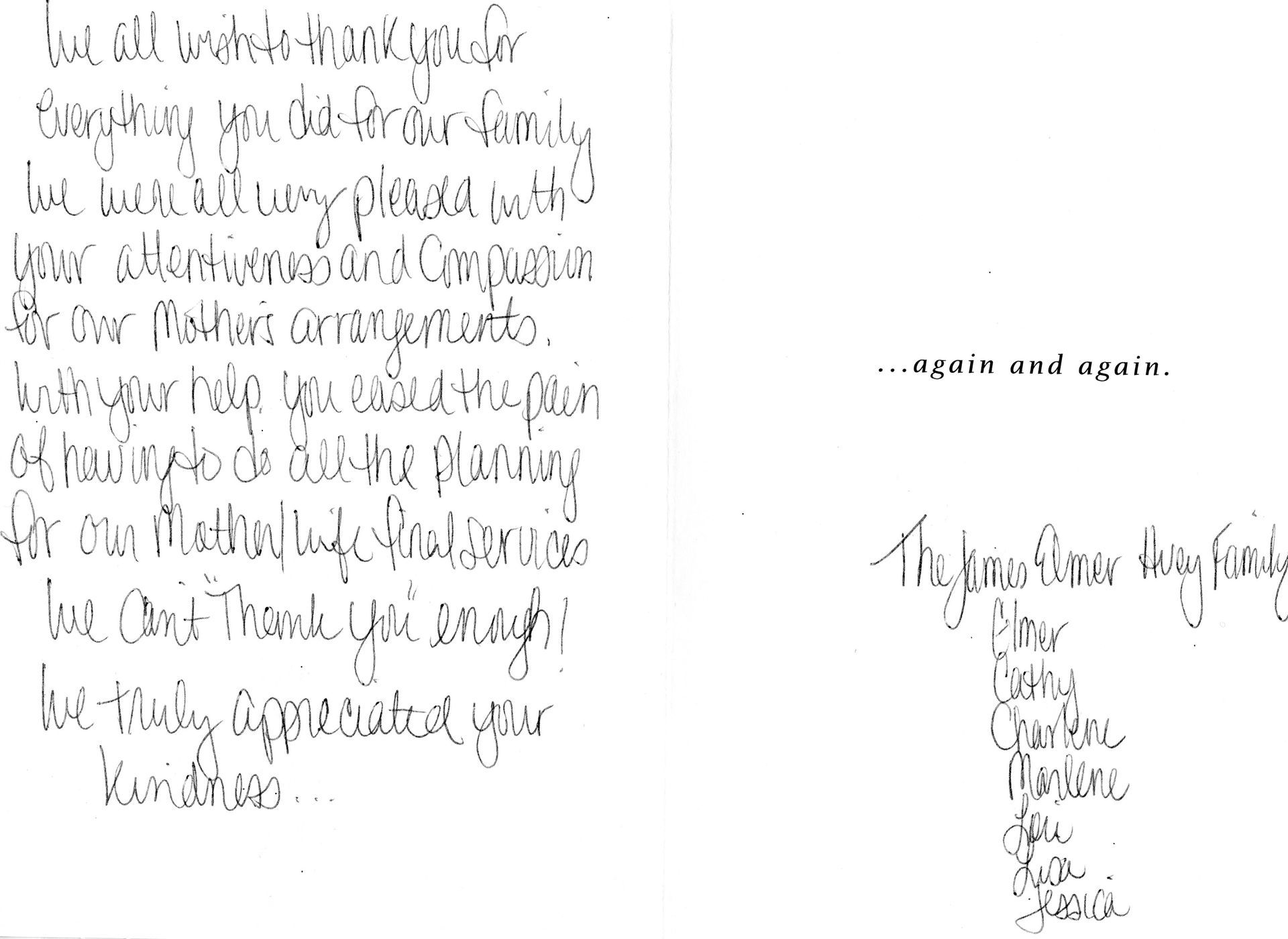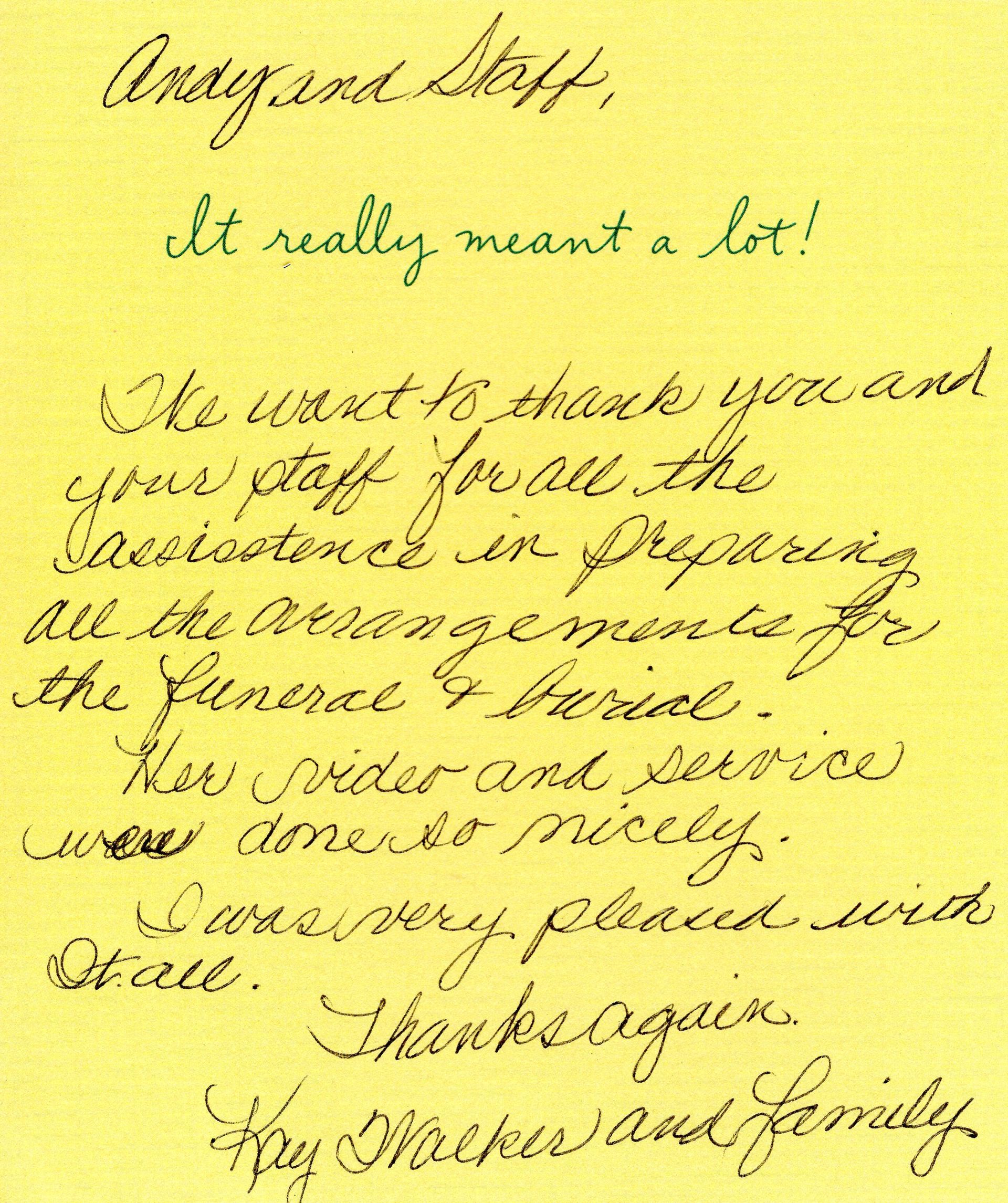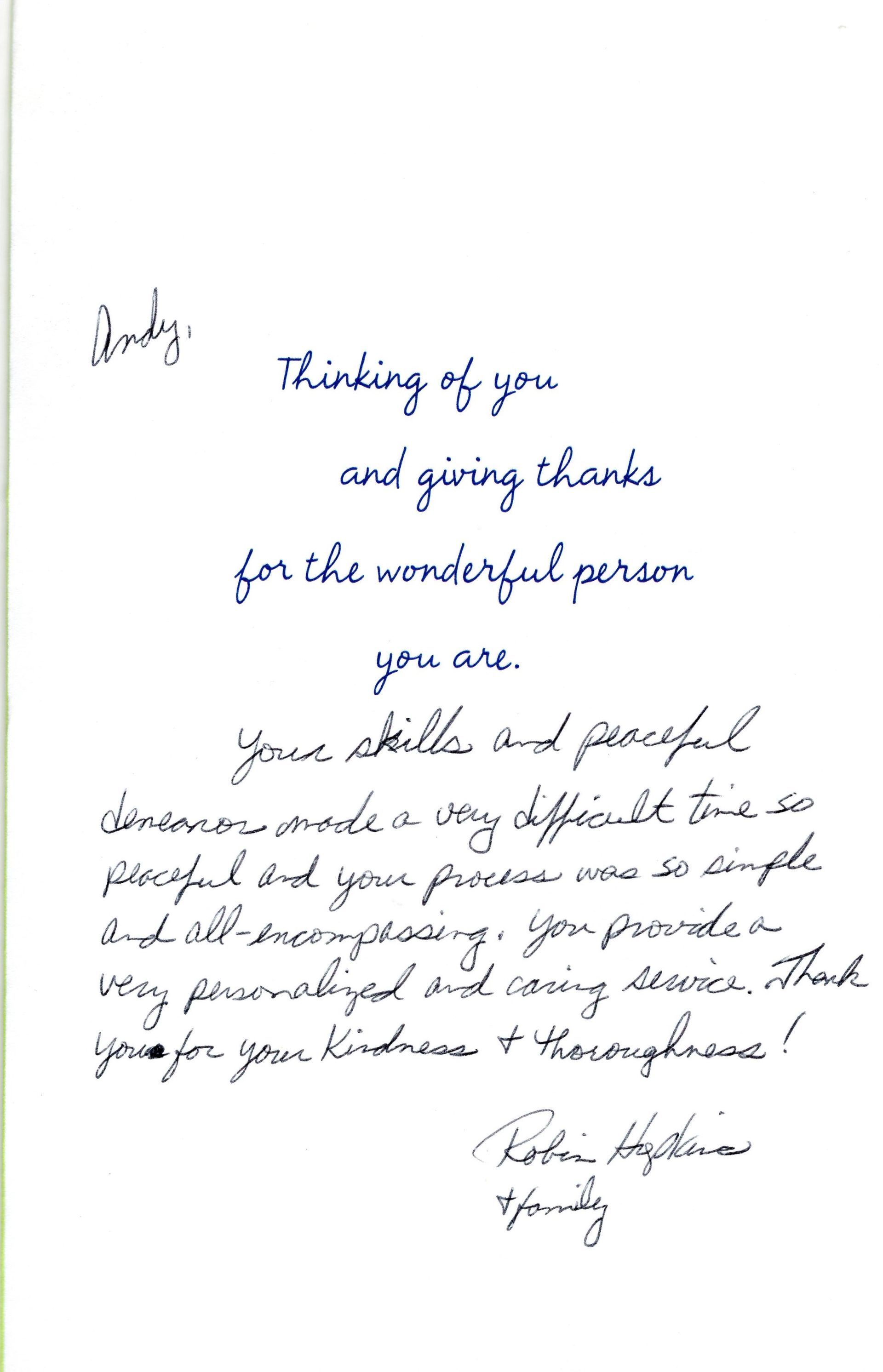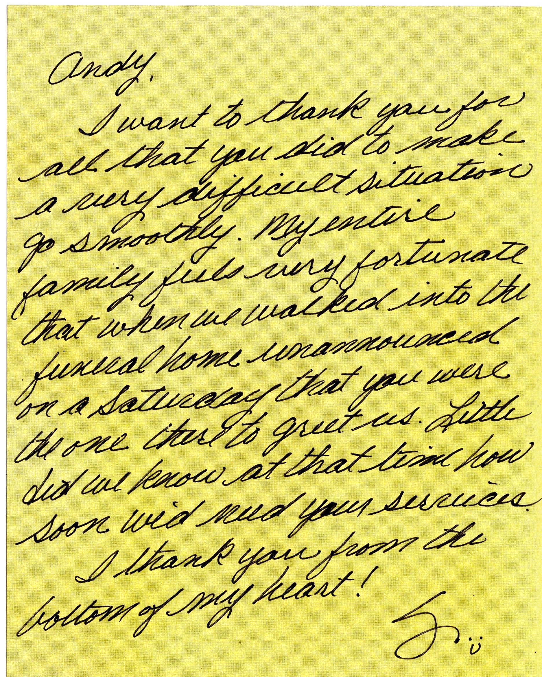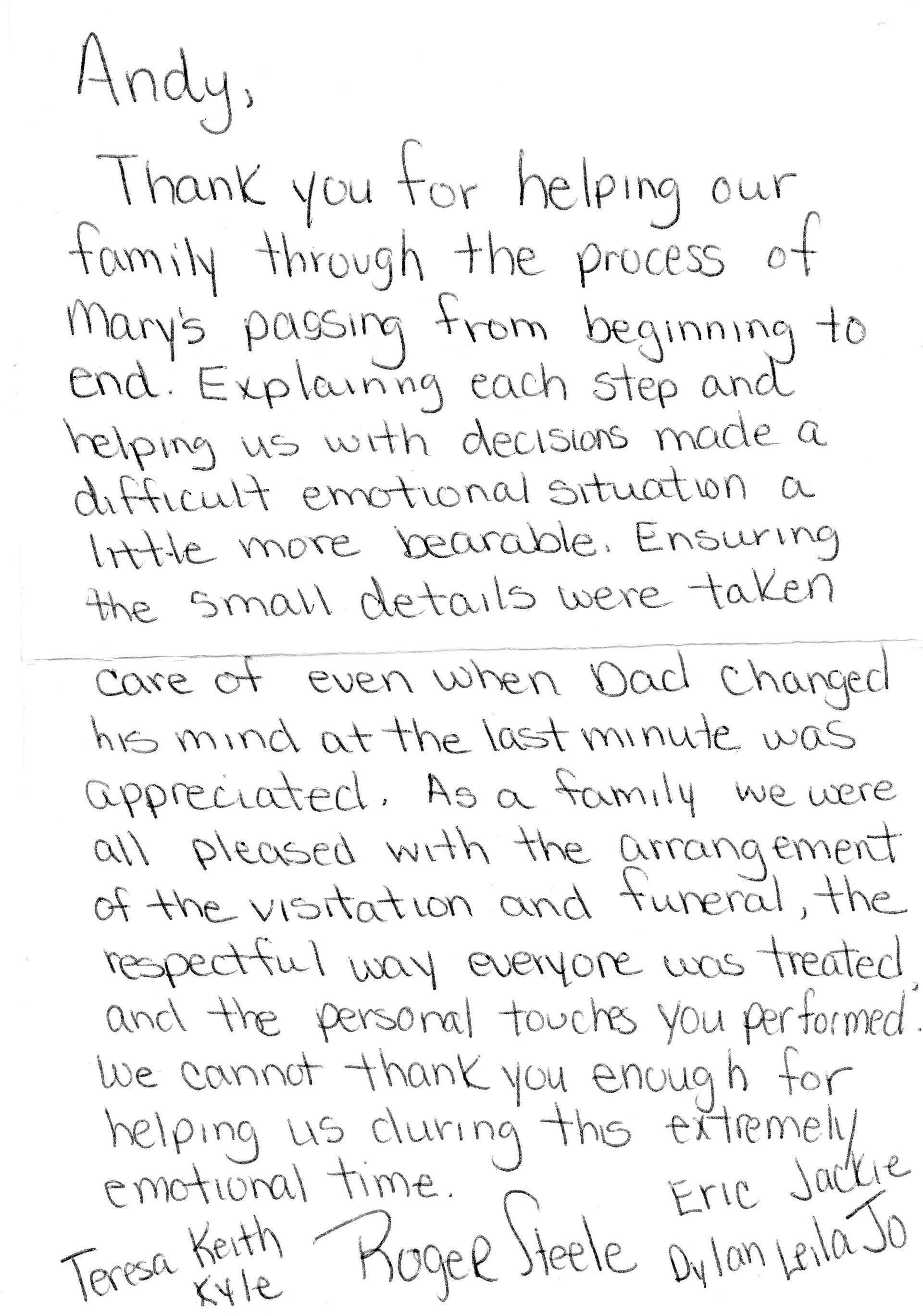 It is our greatest pleasure to hear from families we've served after the service is over. We receive many letters, cards and emails thanking us for our care and attention during their time of need and those words warm our hearts and affirm that we are truly here to serve.
