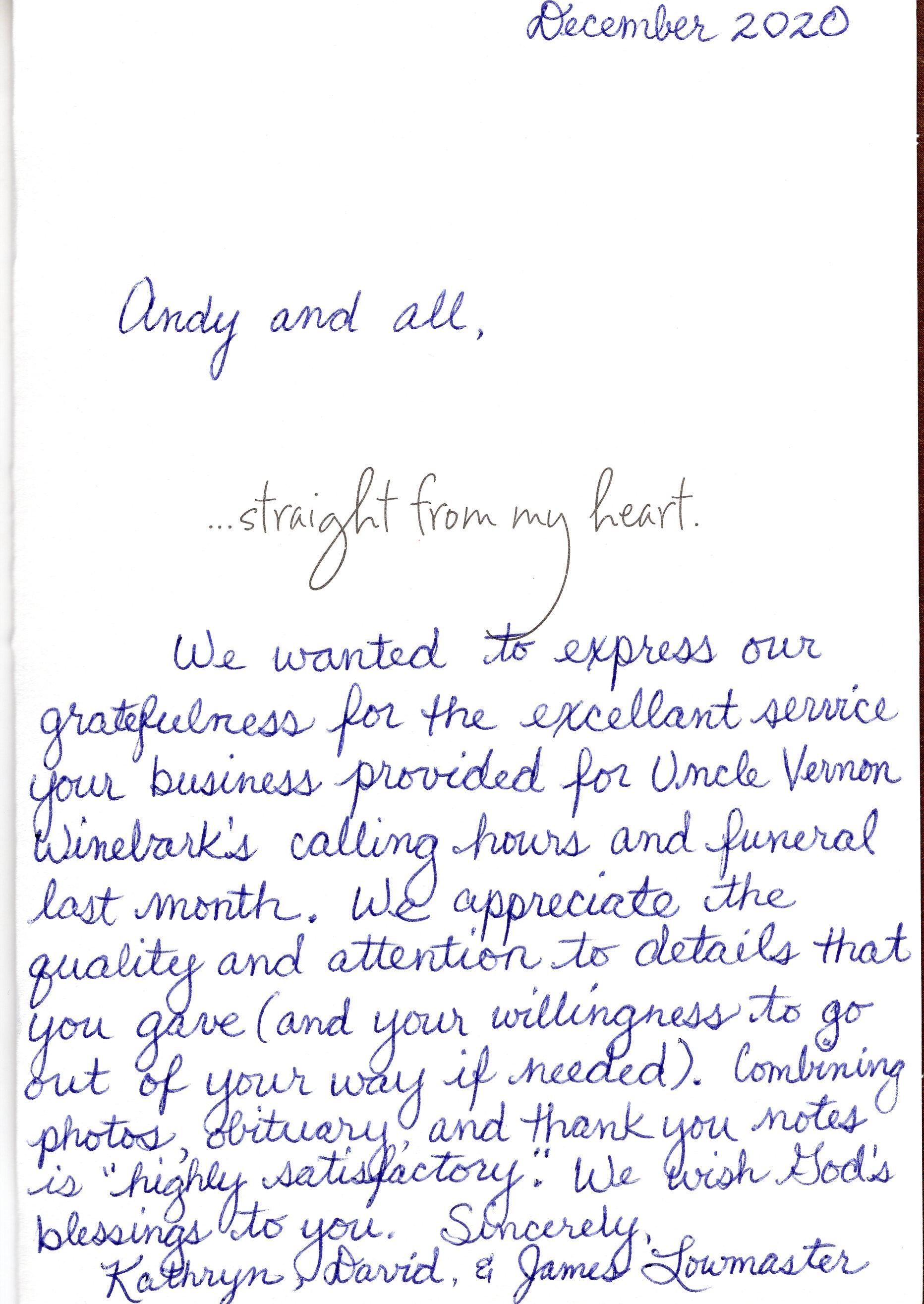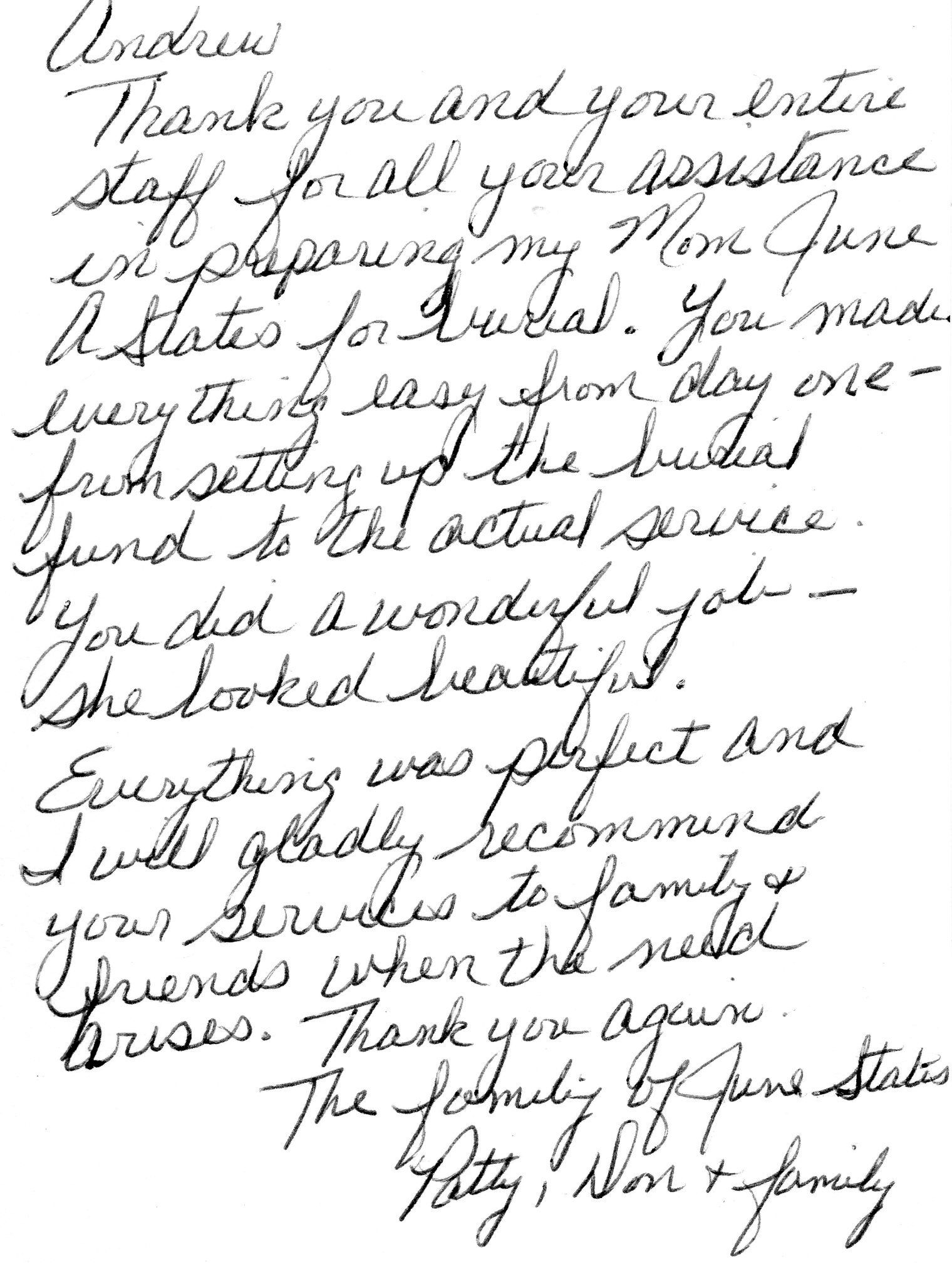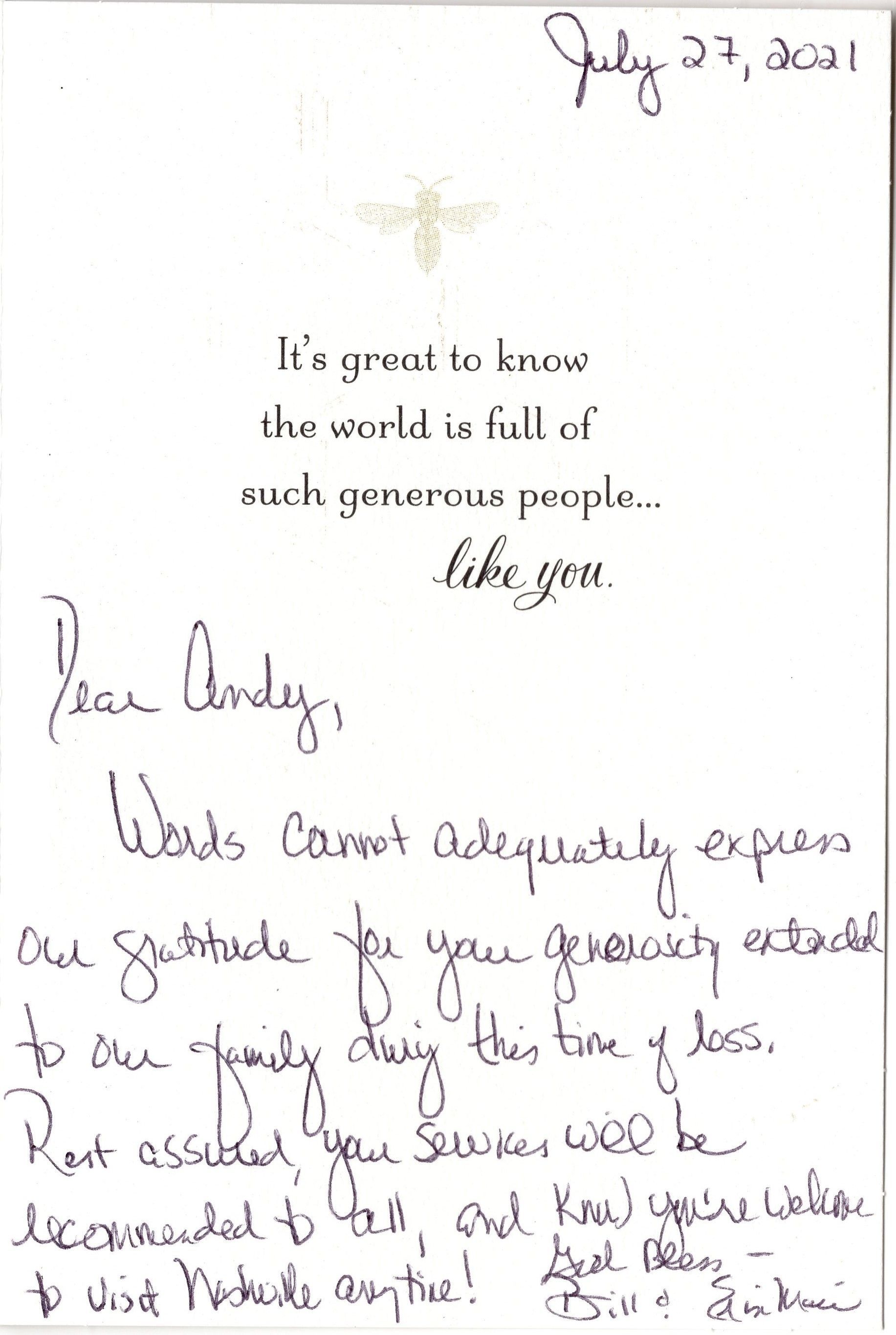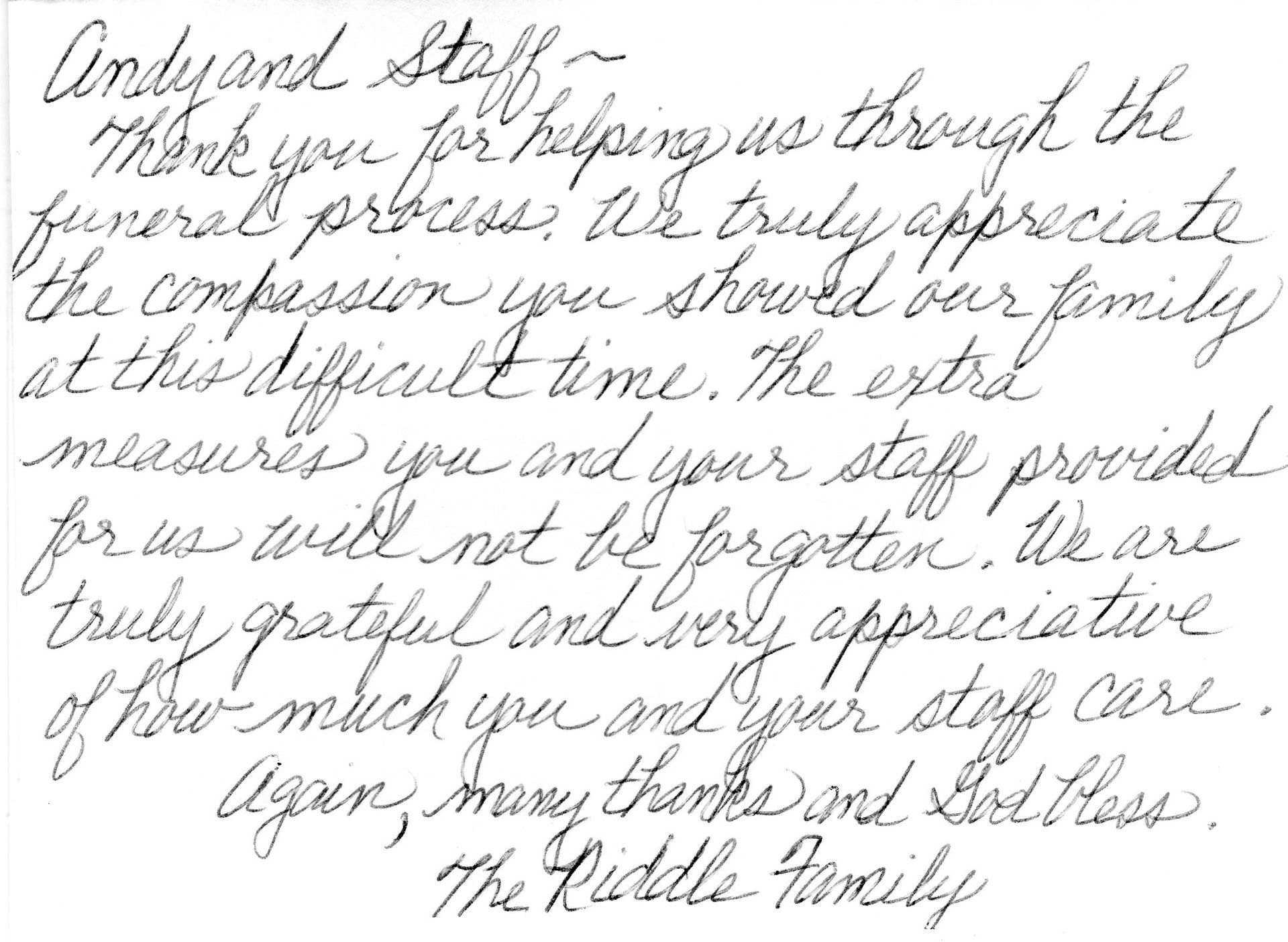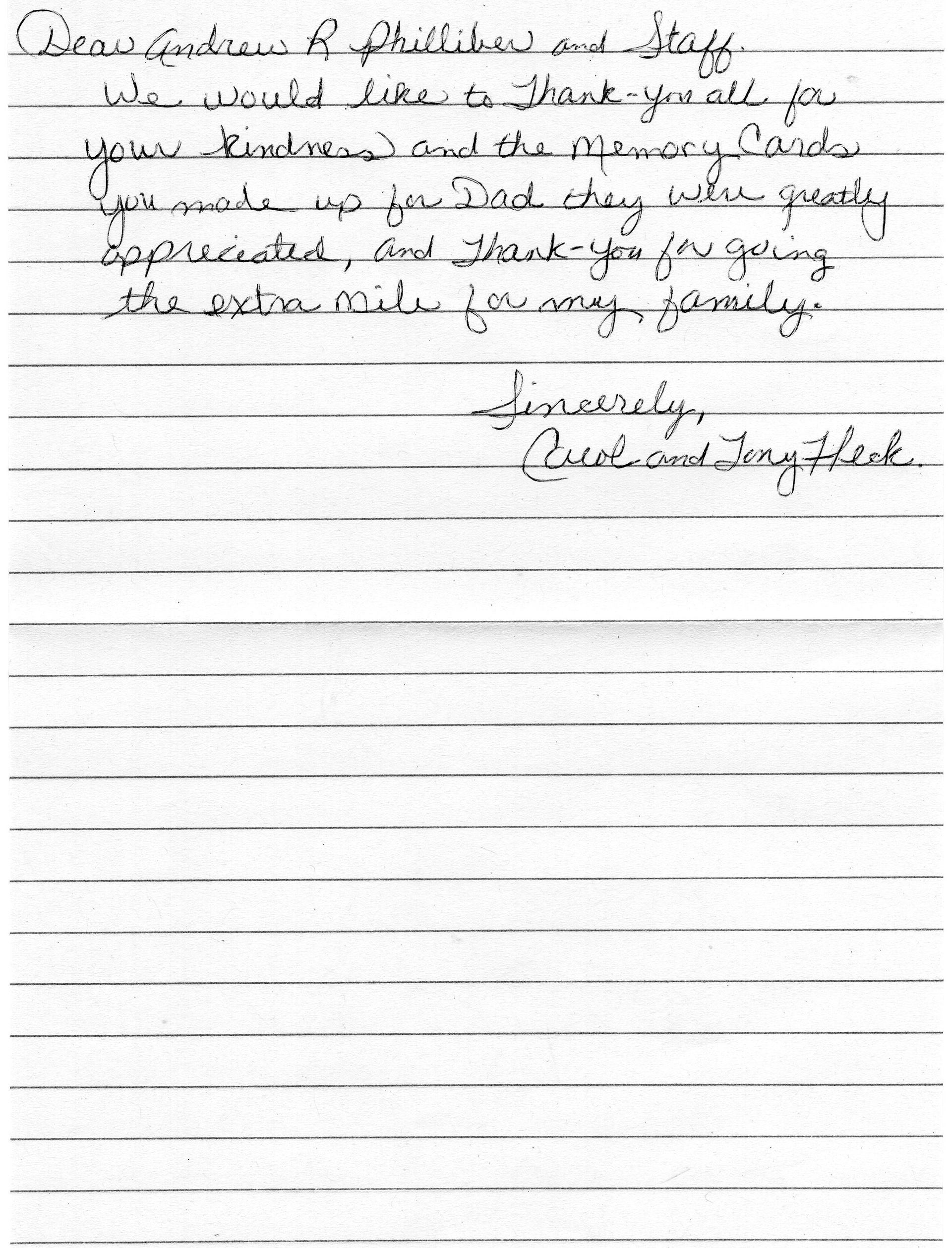 It is our greatest pleasure to hear from families we've served after the service is over. We receive many letters, cards and emails thanking us for our care and attention during their time of need and those words warm our hearts and affirm that we are truly here to serve.