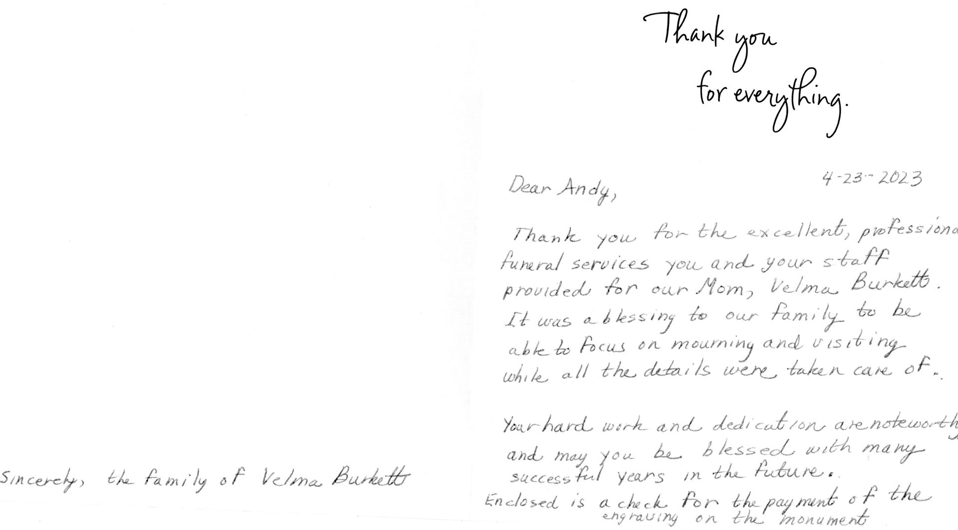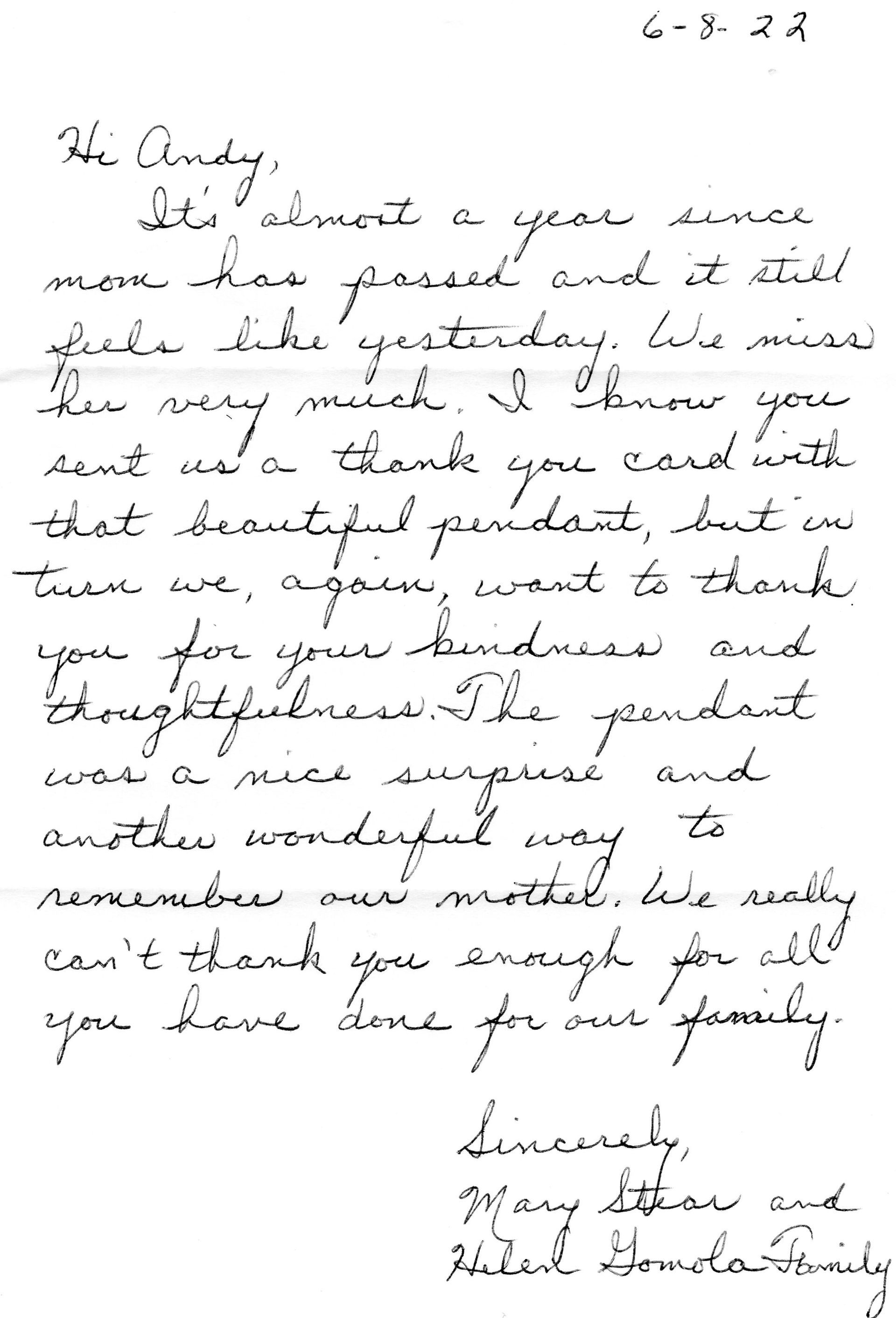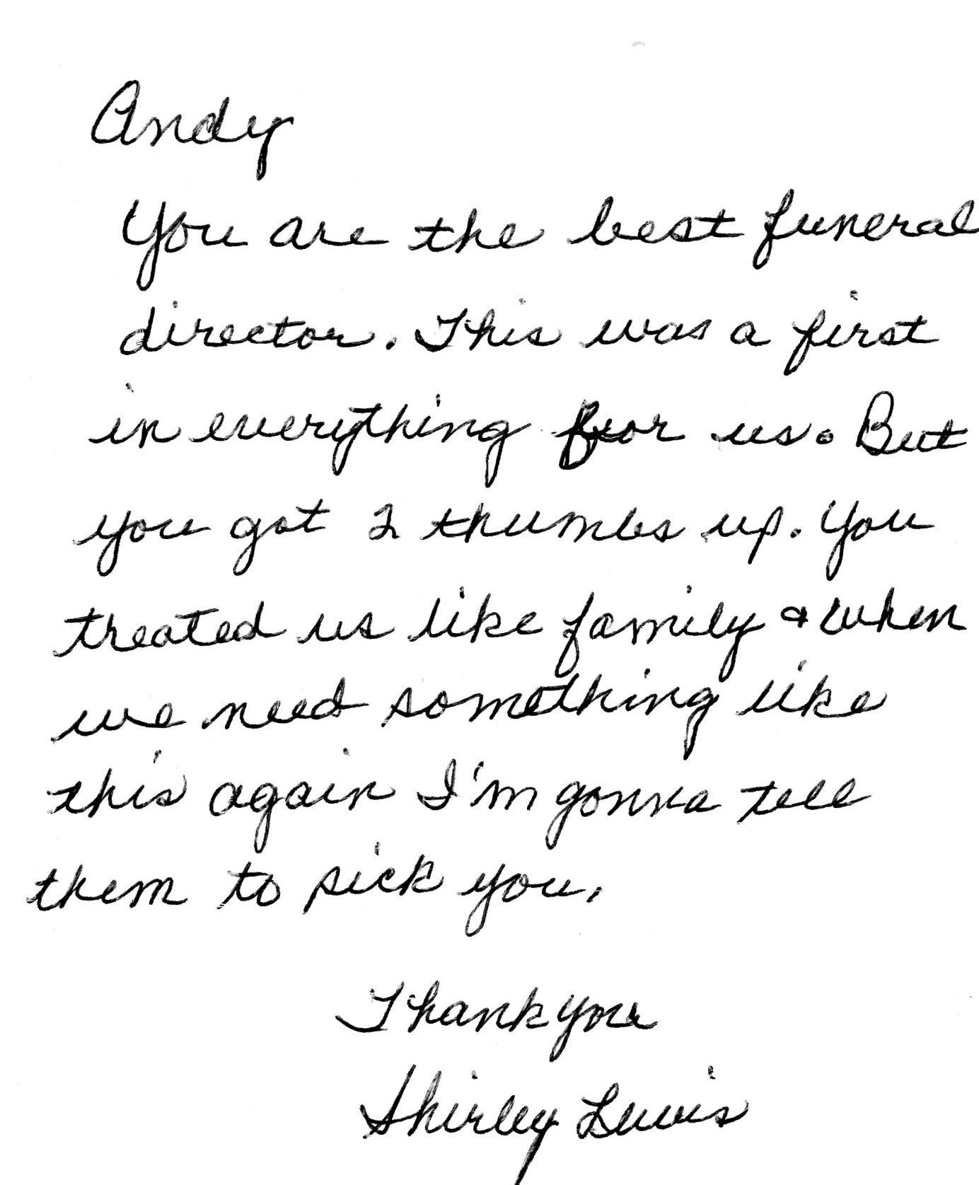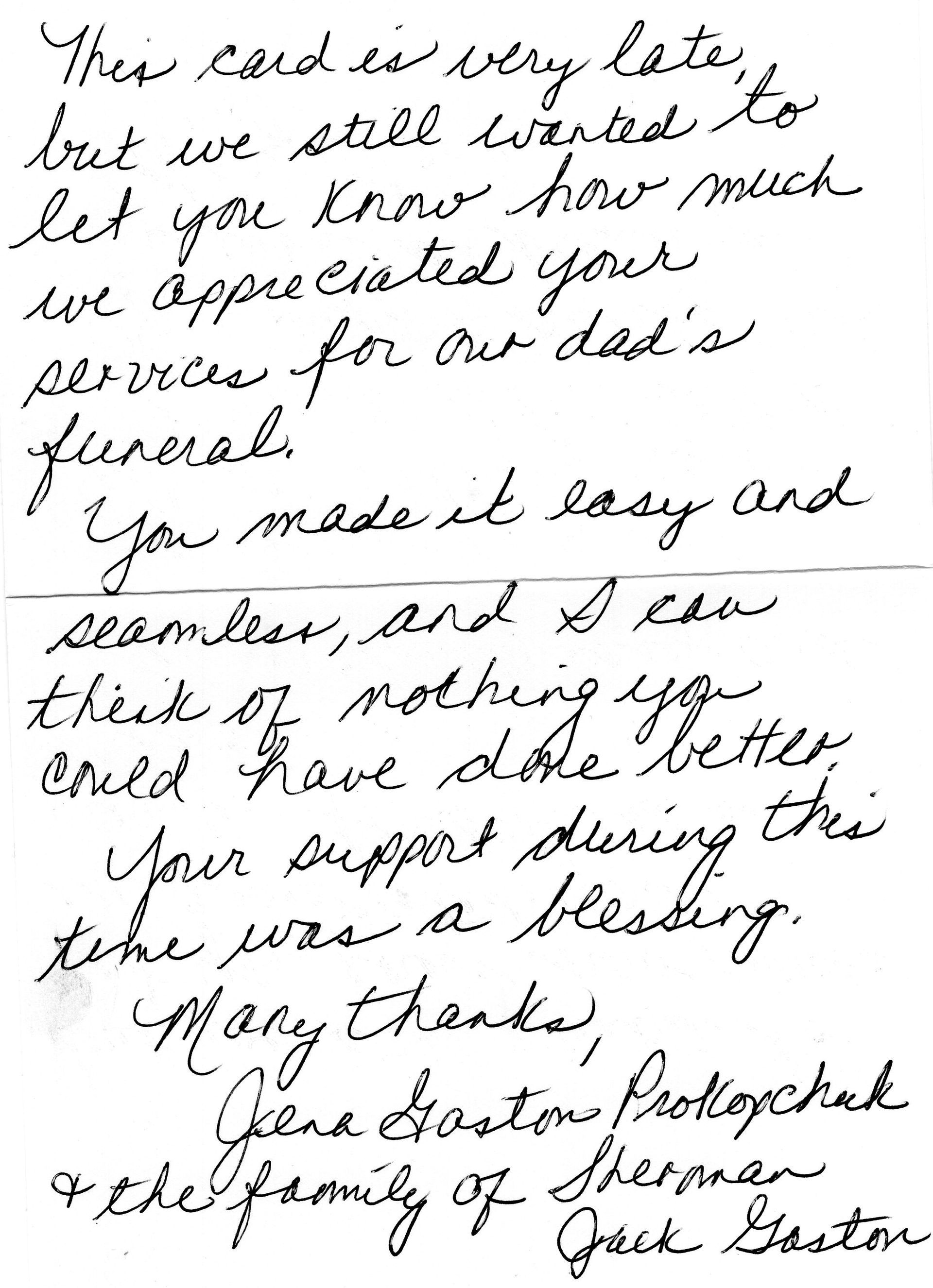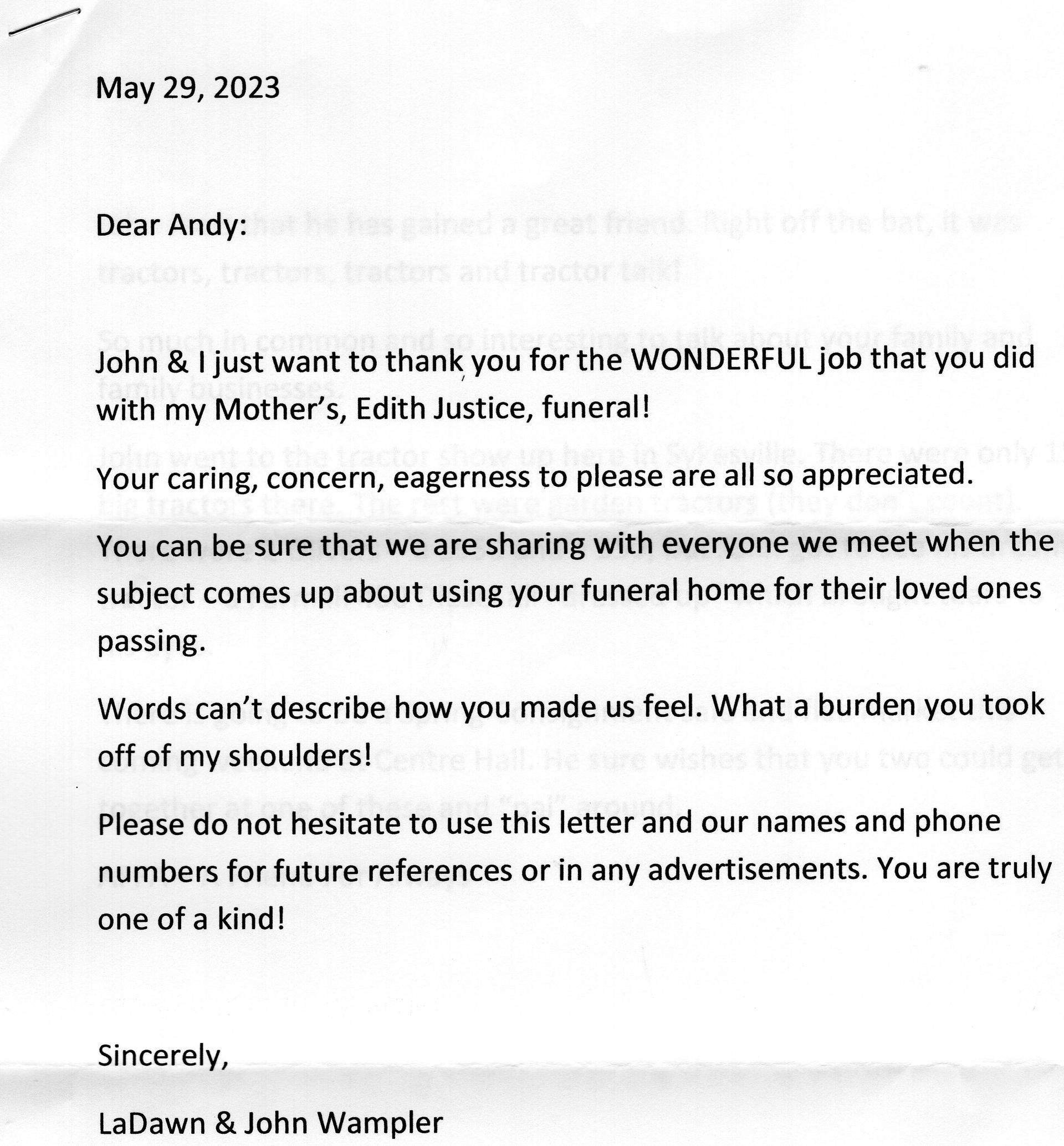 It is our greatest pleasure to hear from families we've served after the service is over. We receive many letters, cards and emails thanking us for our care and attention during their time of need and those words warm our hearts and affirm that we are truly here to serve.