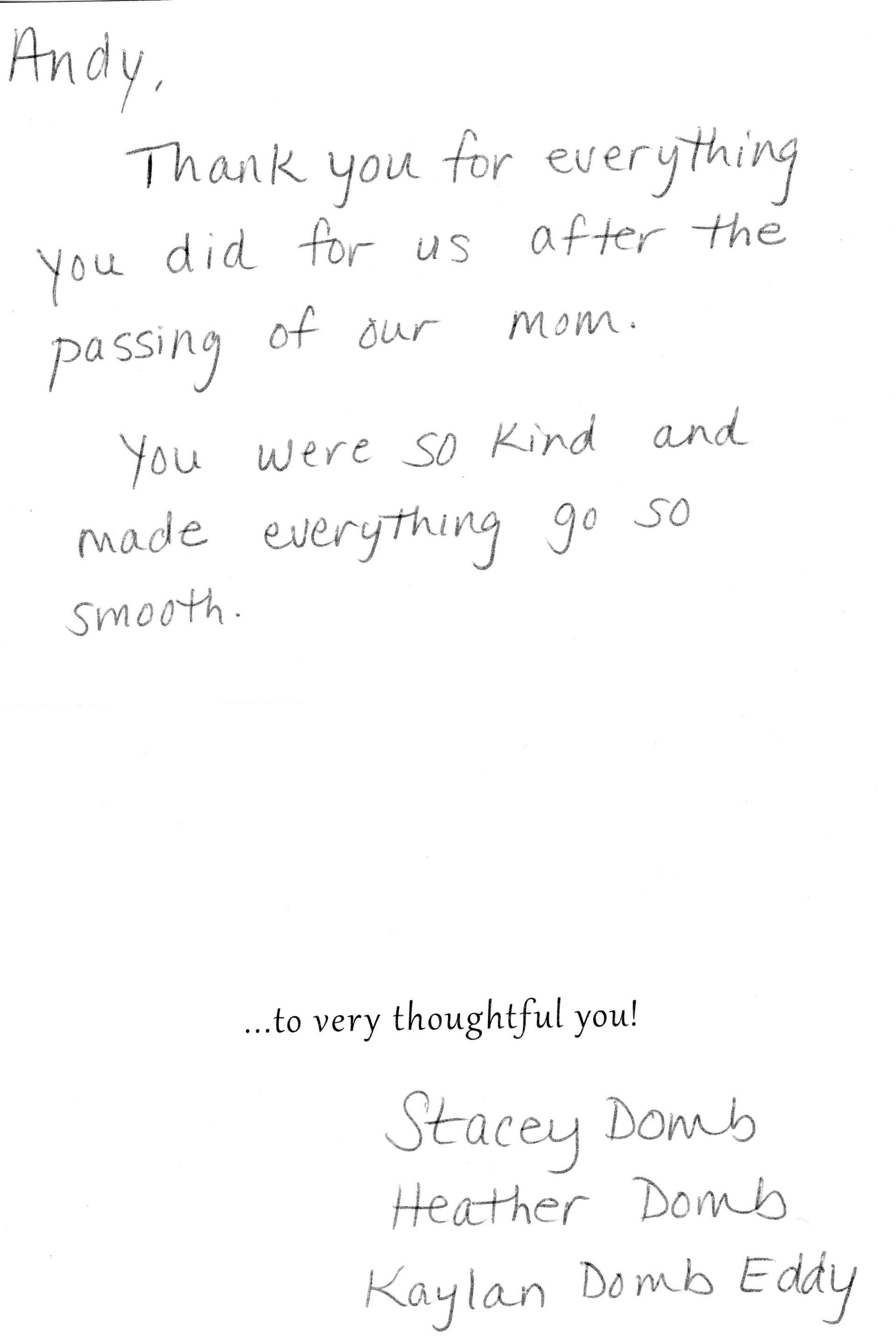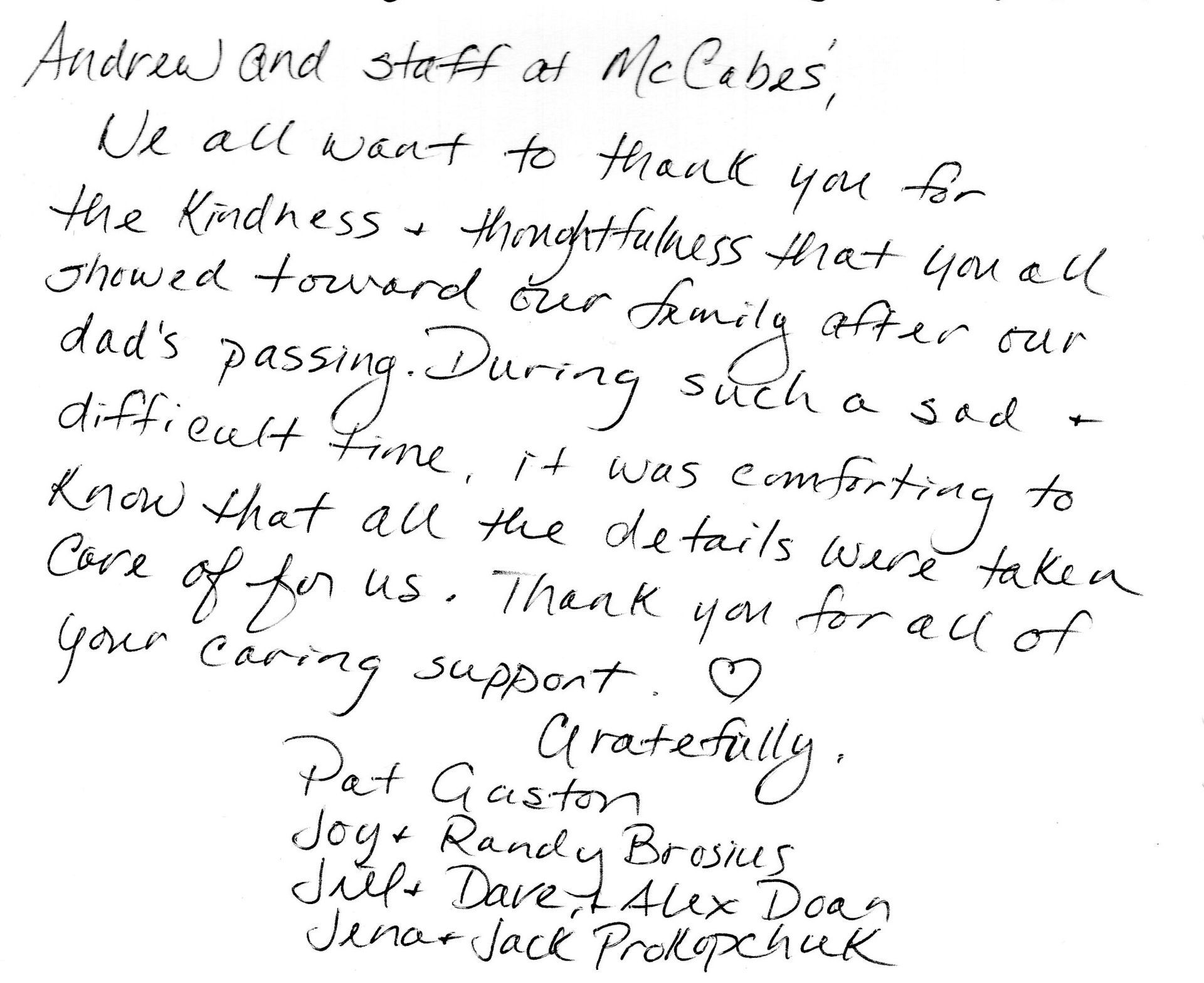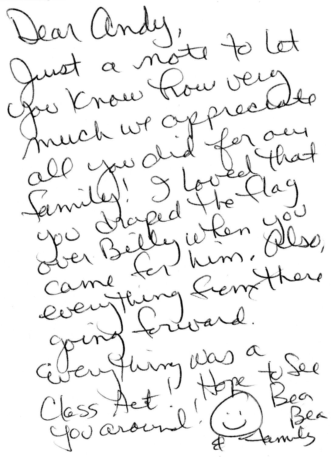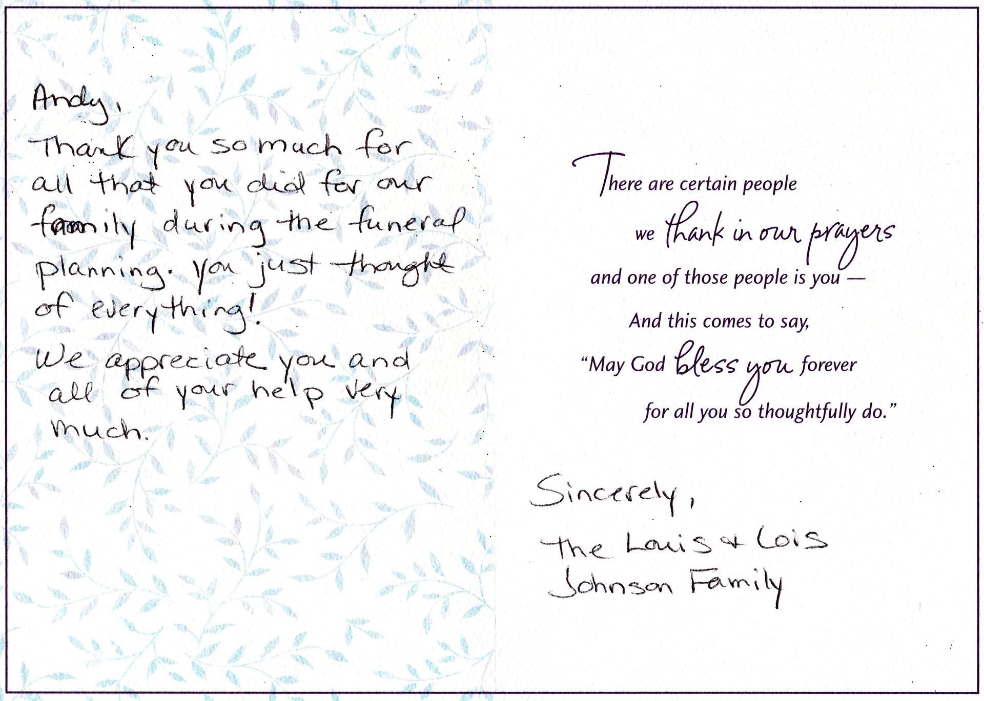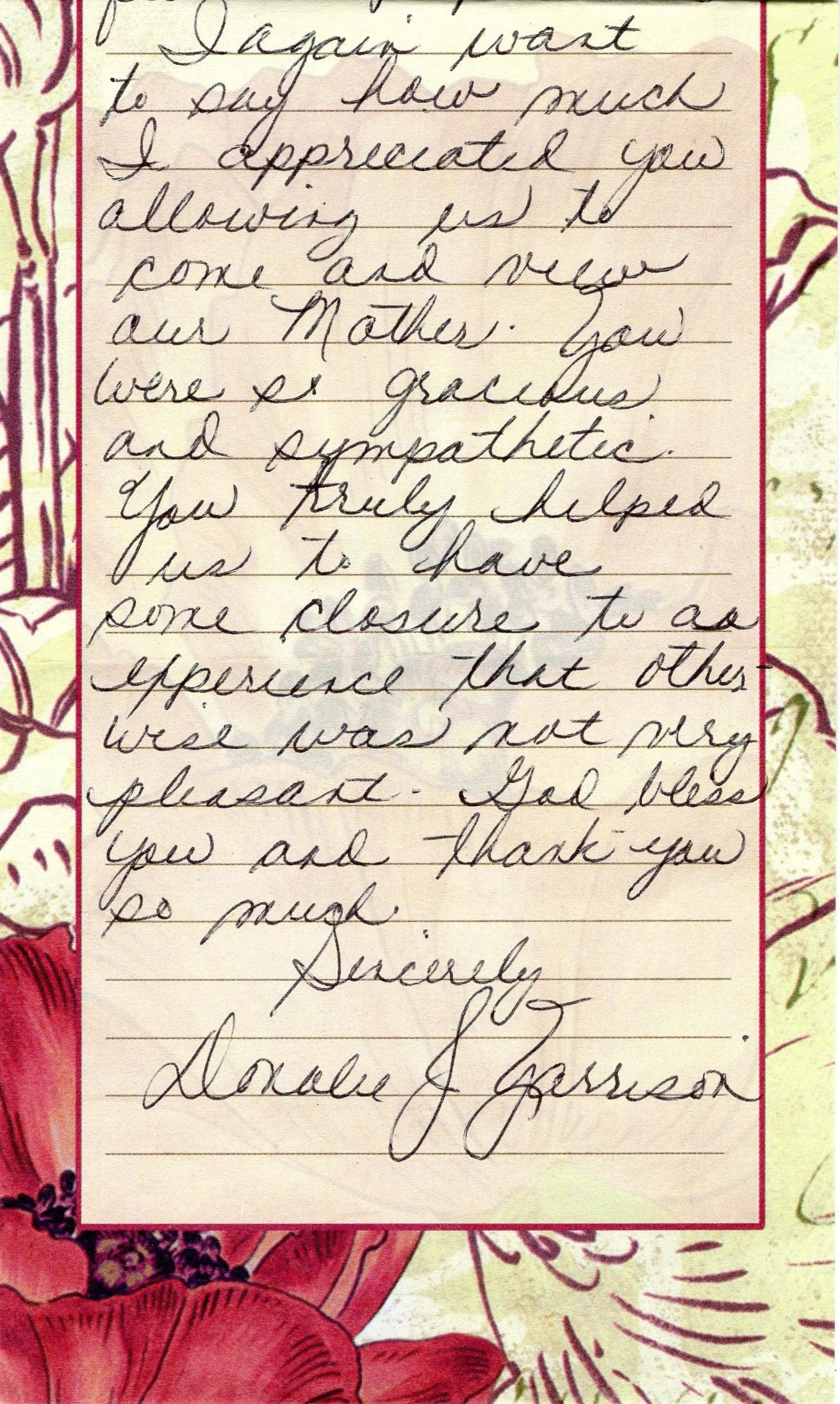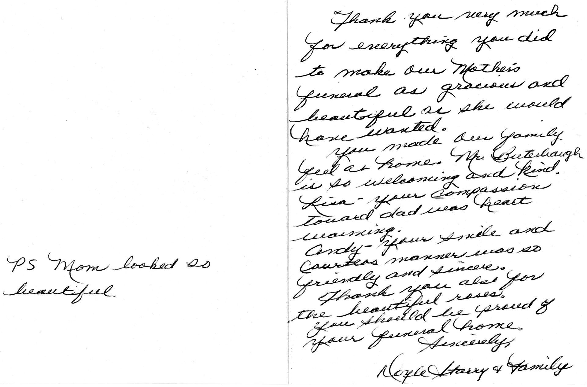 It is our greatest pleasure to hear from families we've served after the service is over. We receive many letters, cards and emails thanking us for our care and attention during their time of need and those words warm our hearts and affirm that we are truly here to serve.